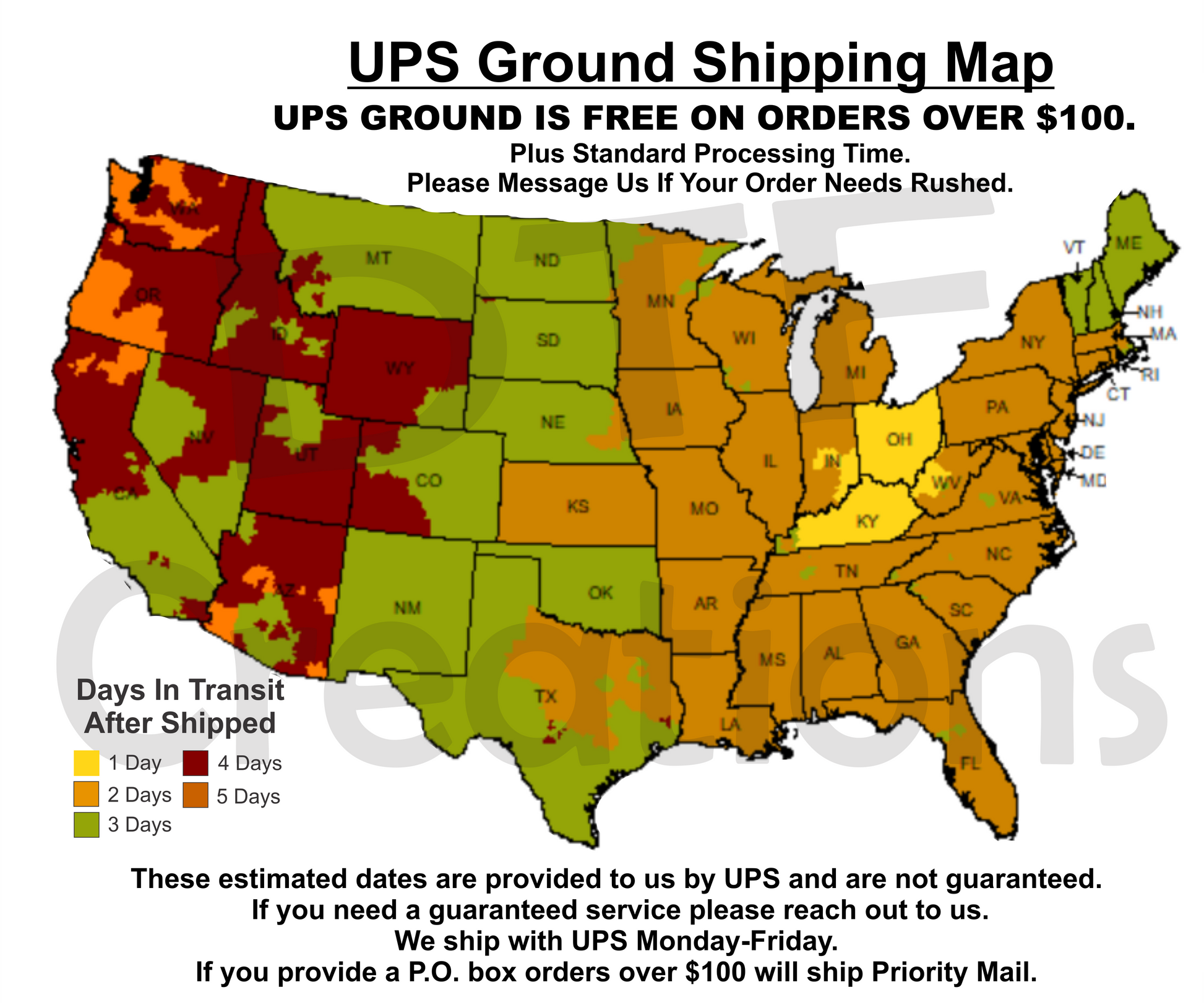 - Please be aware of any Holidays that may affect these times. If USPS/UPS is closed, we will not be able to ship on those days. Don't worry, It will still be produced and package waiting for Carrier pickup on the next business day.